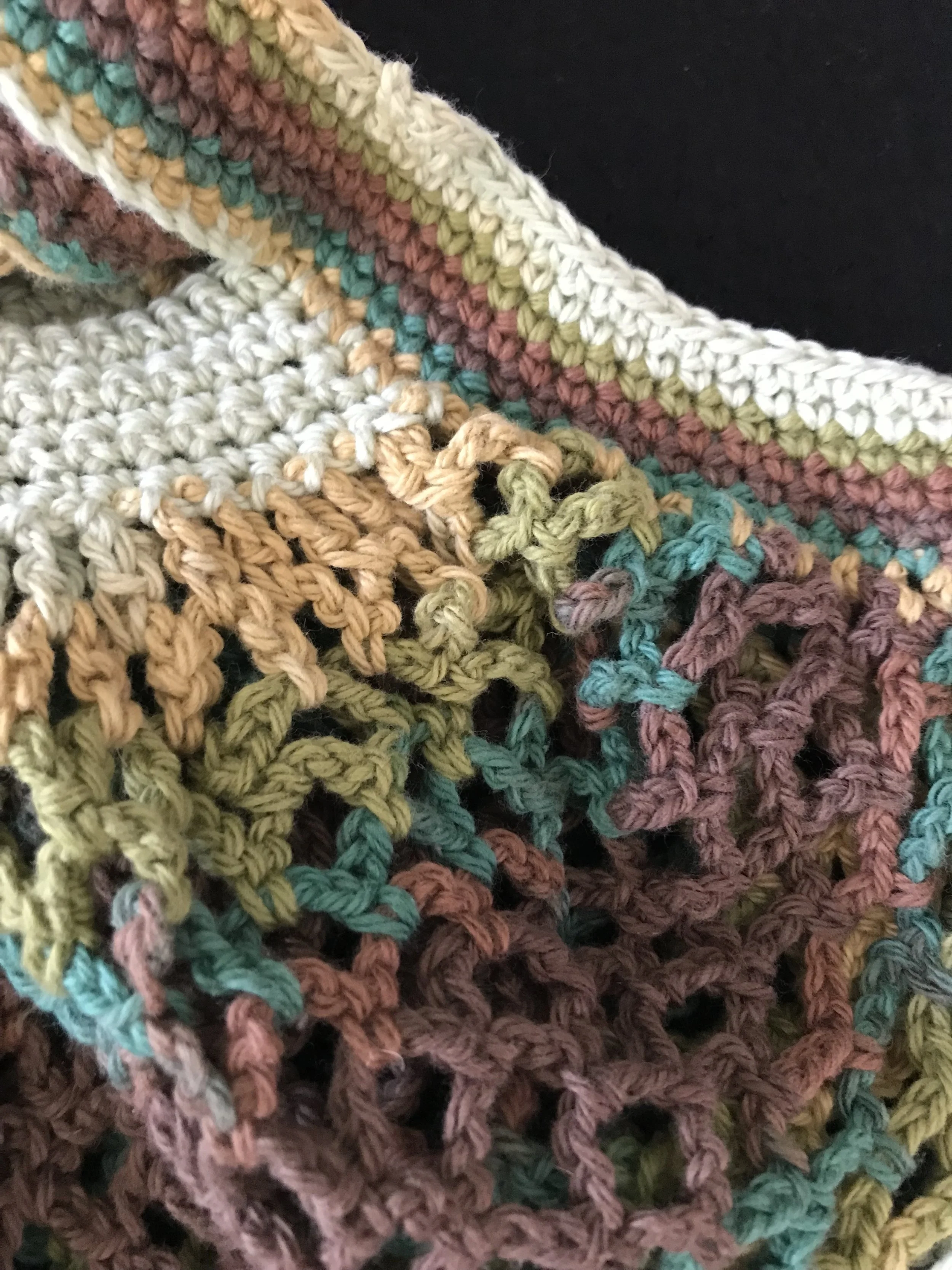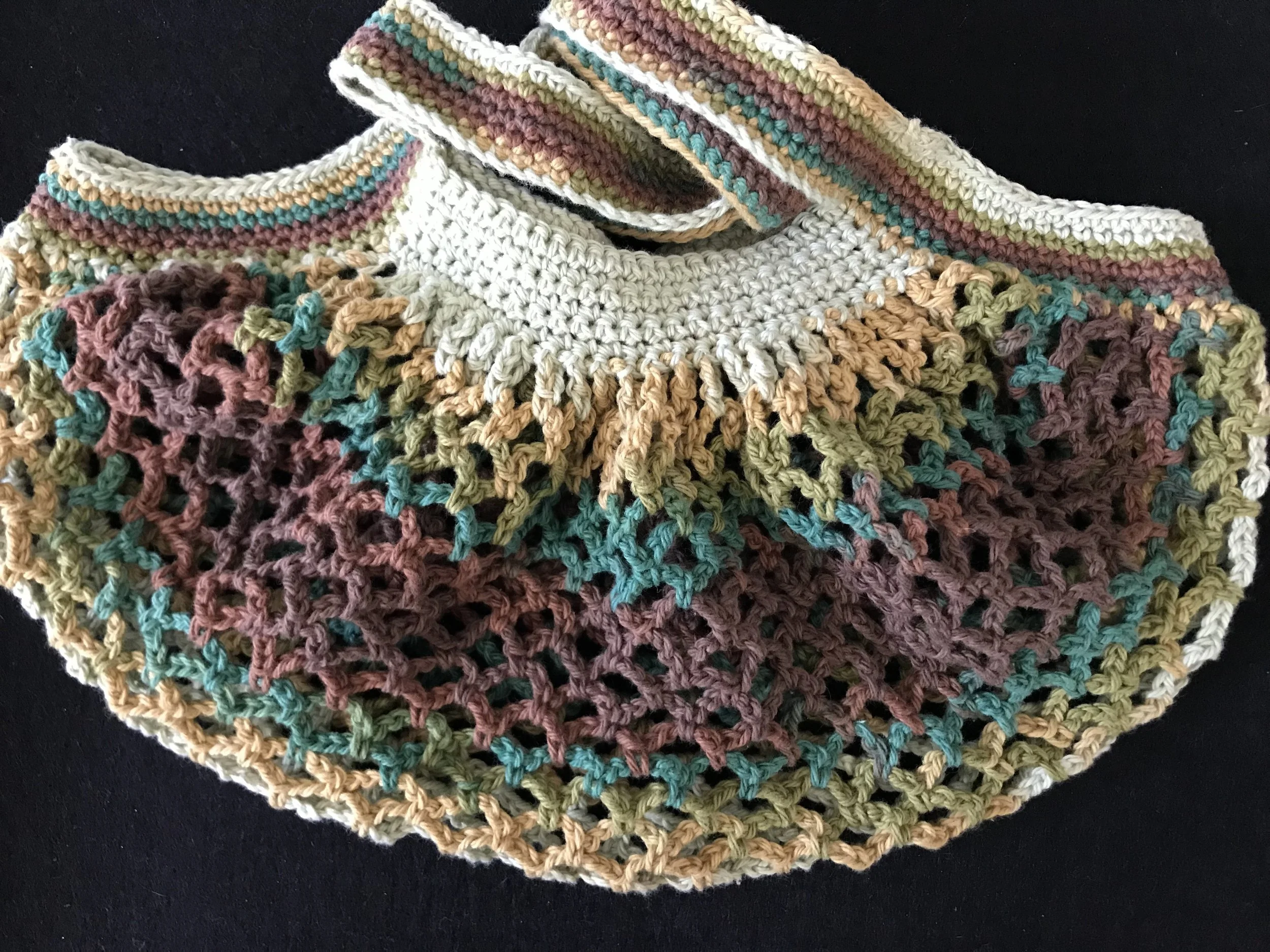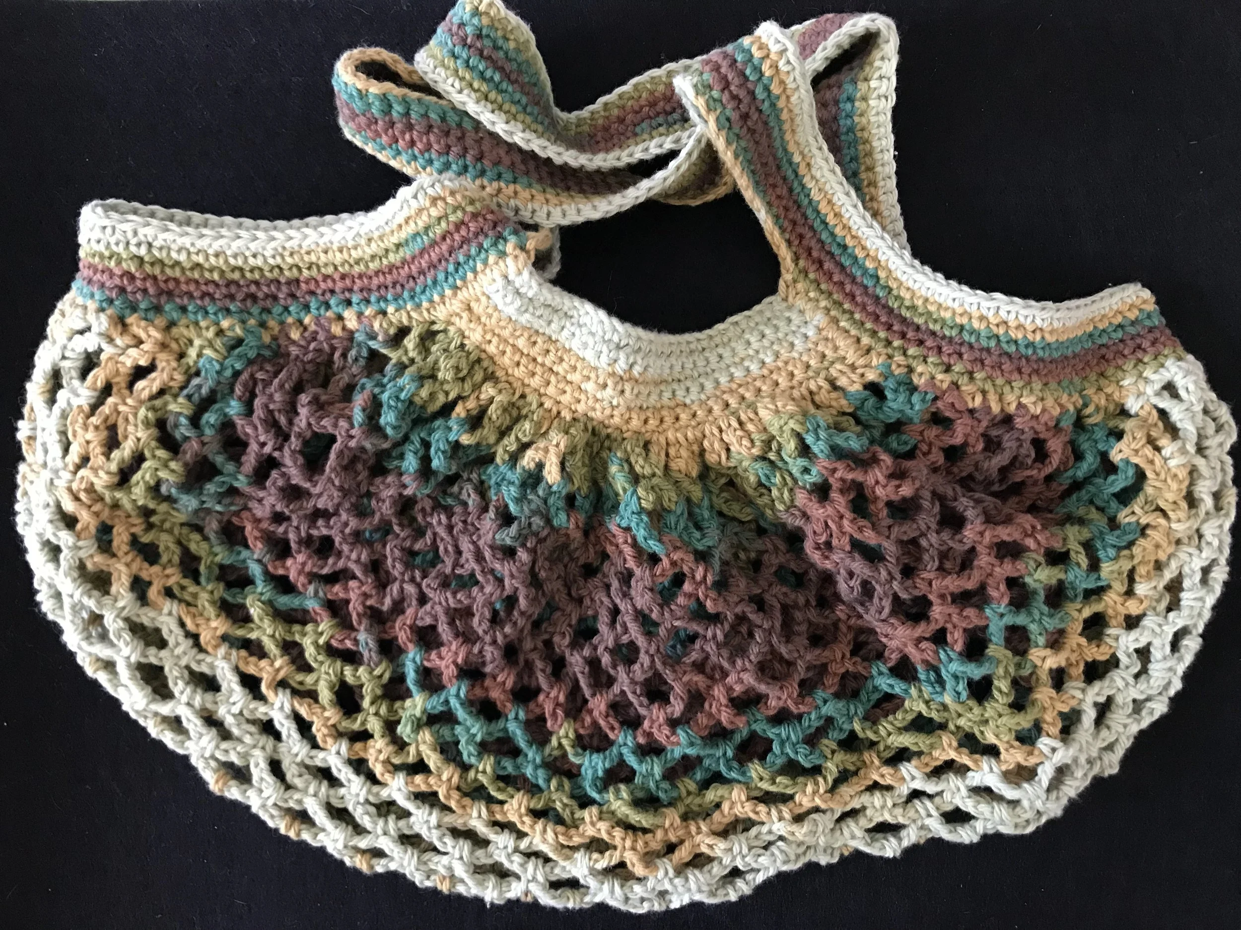 Mesh market bag made from 100% cotton from the brand Abby Road. This bag may look small by the mesh stretches slightly to allow you to carry quite a few items! Great for fruit and vegetables or use it as a hand bag. Hand made by me with love and care
